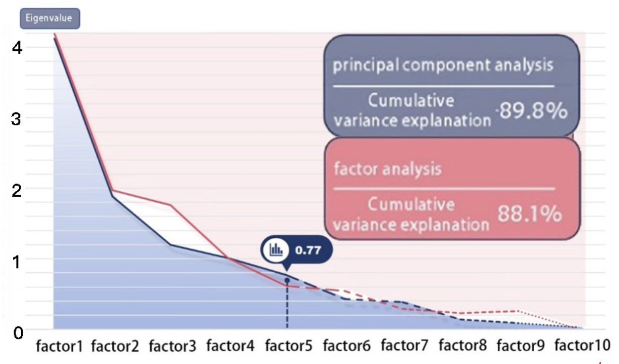 根据各主成分解释数据变异程度,两种模型在特征值下降斜率上存在差异。通过寻找图2中“斜率趋于平缓”的突变点,确定主成分数量为5。