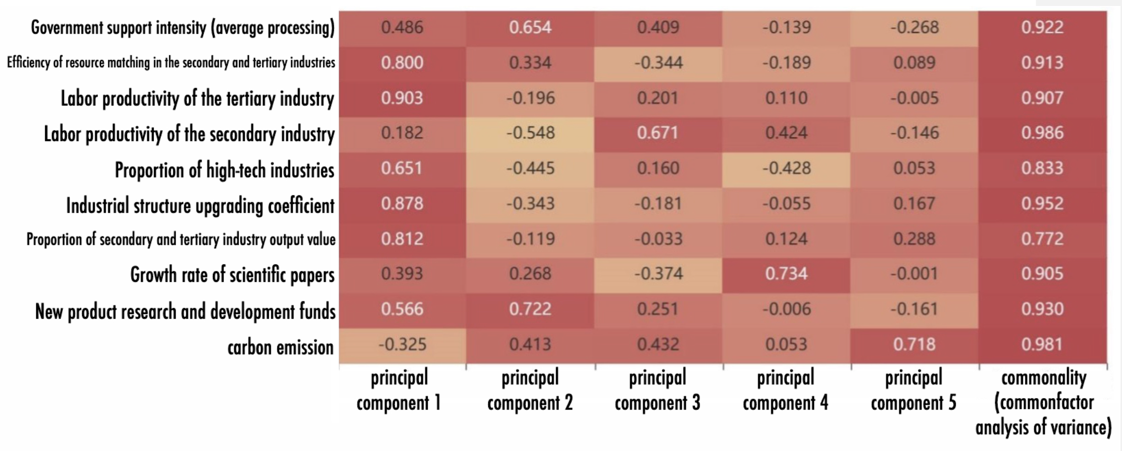 将主成分数量调整为5,重新进行主成分分析,分析各主成分中隐含变量的重要性,并结合具体业务进行各因子的隐含变量分析。各成分生育力指数载荷矩阵热力图如图3所示。