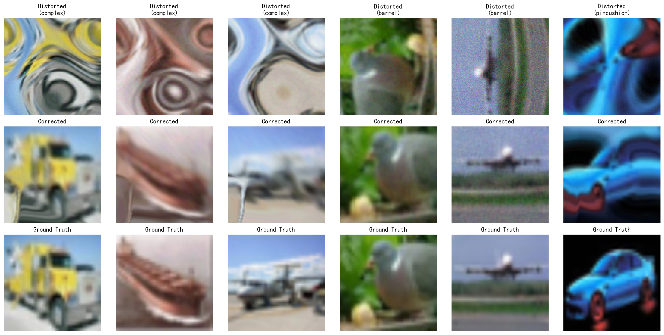 为了评估模型的性能,使用了多种评估指标,包括峰值信噪比(PSNR)、结构相似性指数(SSIM)等。同时,设计了可视化模块,将校正结果与原始畸变图像和真实图像进行对比,直观展示模型的校正效果。那么最后其表现如何呢?我觉得我们可以直接看一下在极端扭曲的情况下模型的表现: