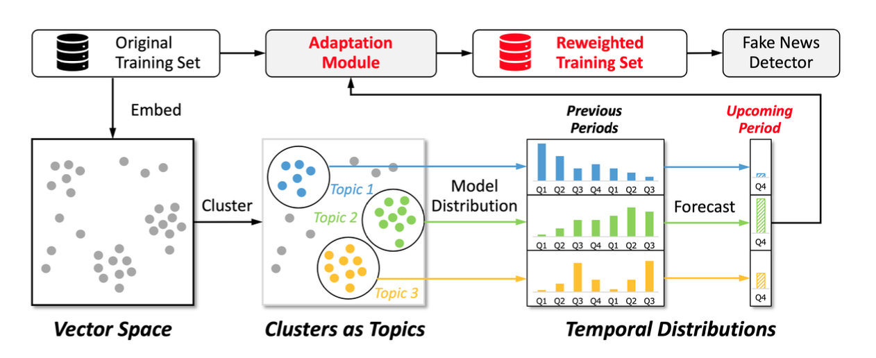 假新闻检测模型在实际部署中面临严峻挑战:当使用历史数据训练模型并应用于未来数据时,由于新闻话题热度、语言表达模式的动态演变,模型性能往往显著下降。这种被称为"时间偏移"(Temporal Shift)的现象源于新闻数据分布随时间变化的特性。现有研究证实,在时间划分的数据集上,模型F1值平均下降8%-12%。本文提出的FTT框架通过建模新闻主题的时间分布规律,预测未来时段的话题热度,并据此调整训练策略,从而提升模型的时间泛化能力。