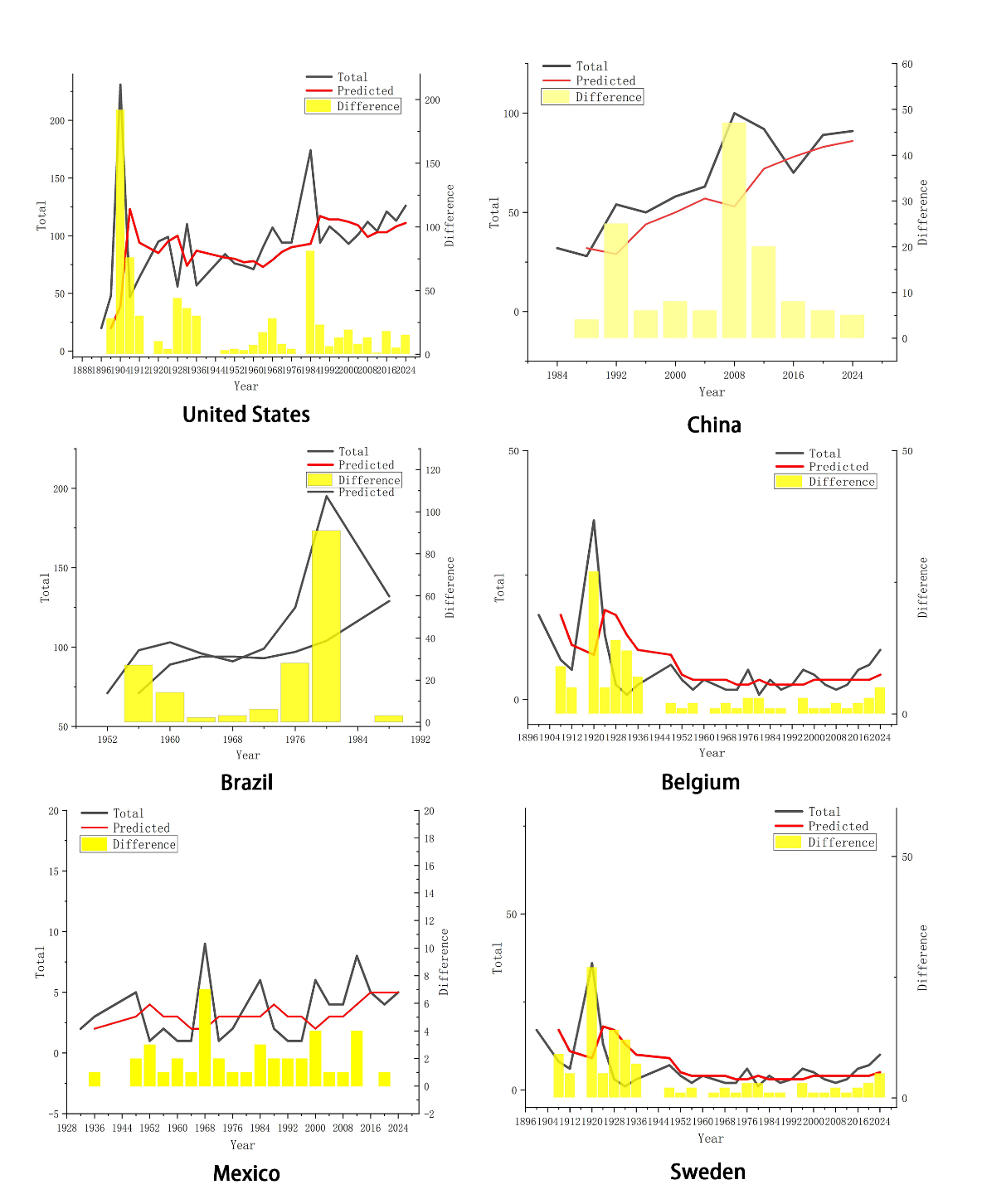 美国在1936年柏林奥运会和1996年亚特兰大奥运会的表现与预测值偏差很小。同样,墨西哥在1968年墨西哥城奥运会前后的表现变化微乎其微。尽管美国和墨西哥的国家实力差异巨大,但这种现象表明他们的奖牌数可能已达到其国家能力允许的"瓶颈",意味着其体育实力已趋于稳定。即使有东道主效应,也难以进一步提升其奖牌表现。这一发现表明,东道主效应并不总能显著提升奖牌数,特别是在体育实力已达到较高水平的国家。