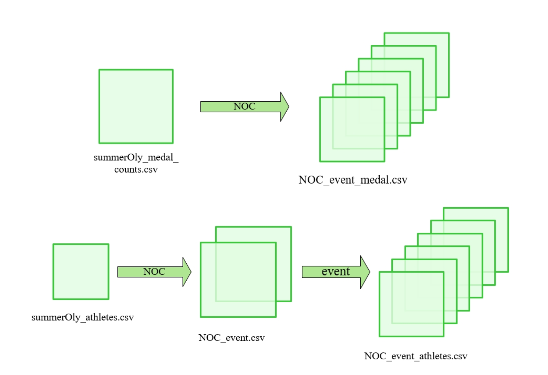 为了简化数据统计和分析,我们对提供的数据集进行了拆分和整合。这个过程产生了新的数据集,例如各国在各个运动项目的奖牌成就以及特定赛事中各国的运动员数据。重组后的数据示例如下: