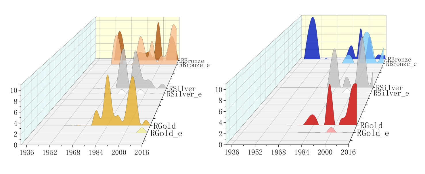 然而,通过观察上述3D图表,我们可以注意到Béla Károlyi对罗马尼亚和美国体操队的影响是深远且持久的——两支队伍都在金牌和银牌上实现了从零到一的突破,从那时起他们的奖牌数量显著增加。郎平带领美国队在16年空白期后获得银牌,重返领奖台…但这种模式似乎不适用于中国队:在郎平两次执教后的第一届奥运会上,中国队取得了不同的成绩(一次银牌一次金牌),而在随后的第二届和第三届奥运会上,他们并未表现出"持续实力",表现波动显著。