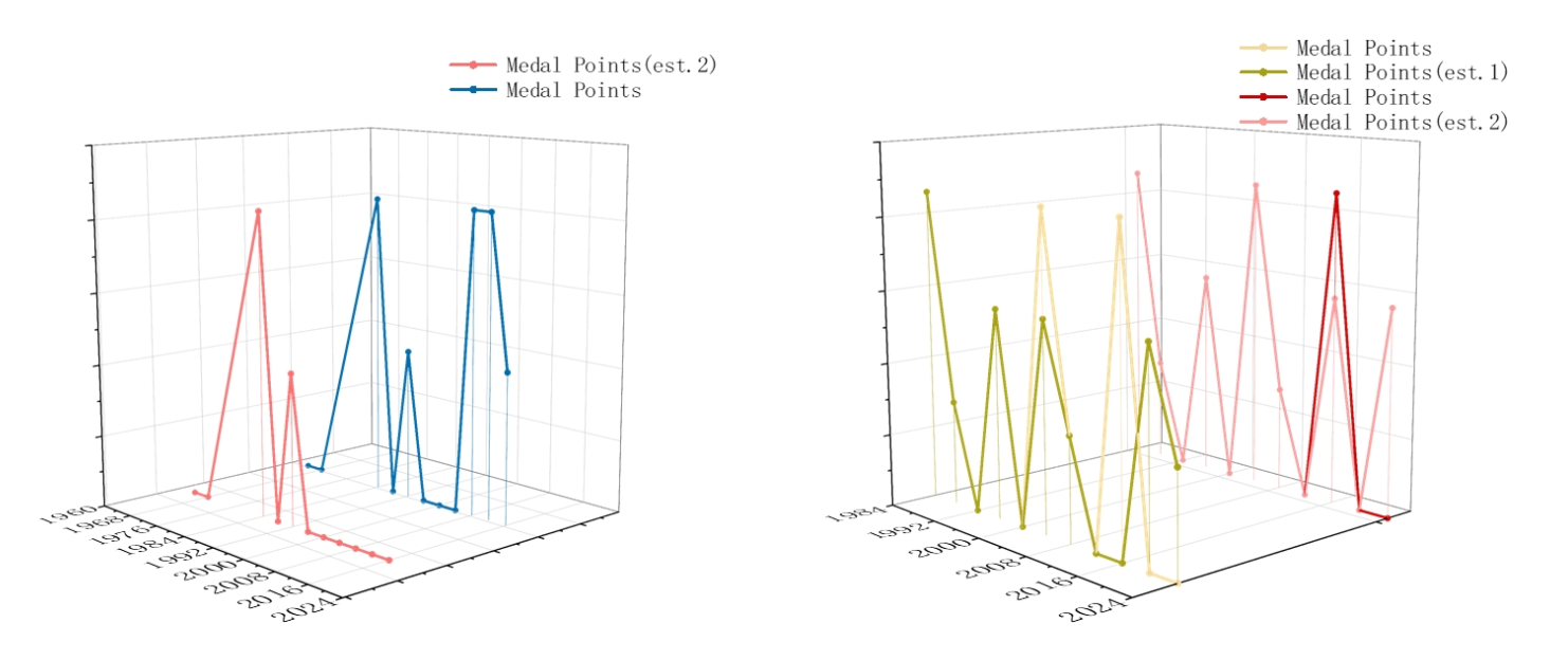 我们基于奖牌的价值和数量将奖牌成就量化为因变量,并构建了"无名教练"情景下的奖牌变化。通过将预测结果与实际数据比较,我们得到了以下3D图表:
