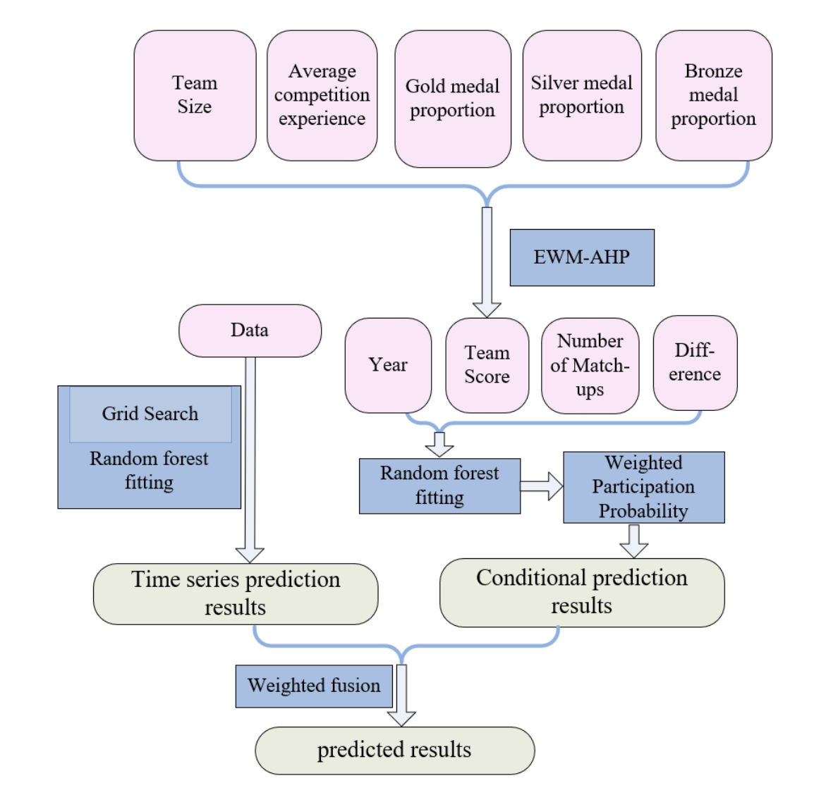 随后,我们将通过加权融合方法将基于时间序列和基于条件的预测模型结合起来,建立最终的预测模型。此外,通过分析一个国家内各代表团的历史奖牌概率,我们可以确定哪些代表团最有可能赢得奖牌,并识别每个国家最依赖的运动项目。